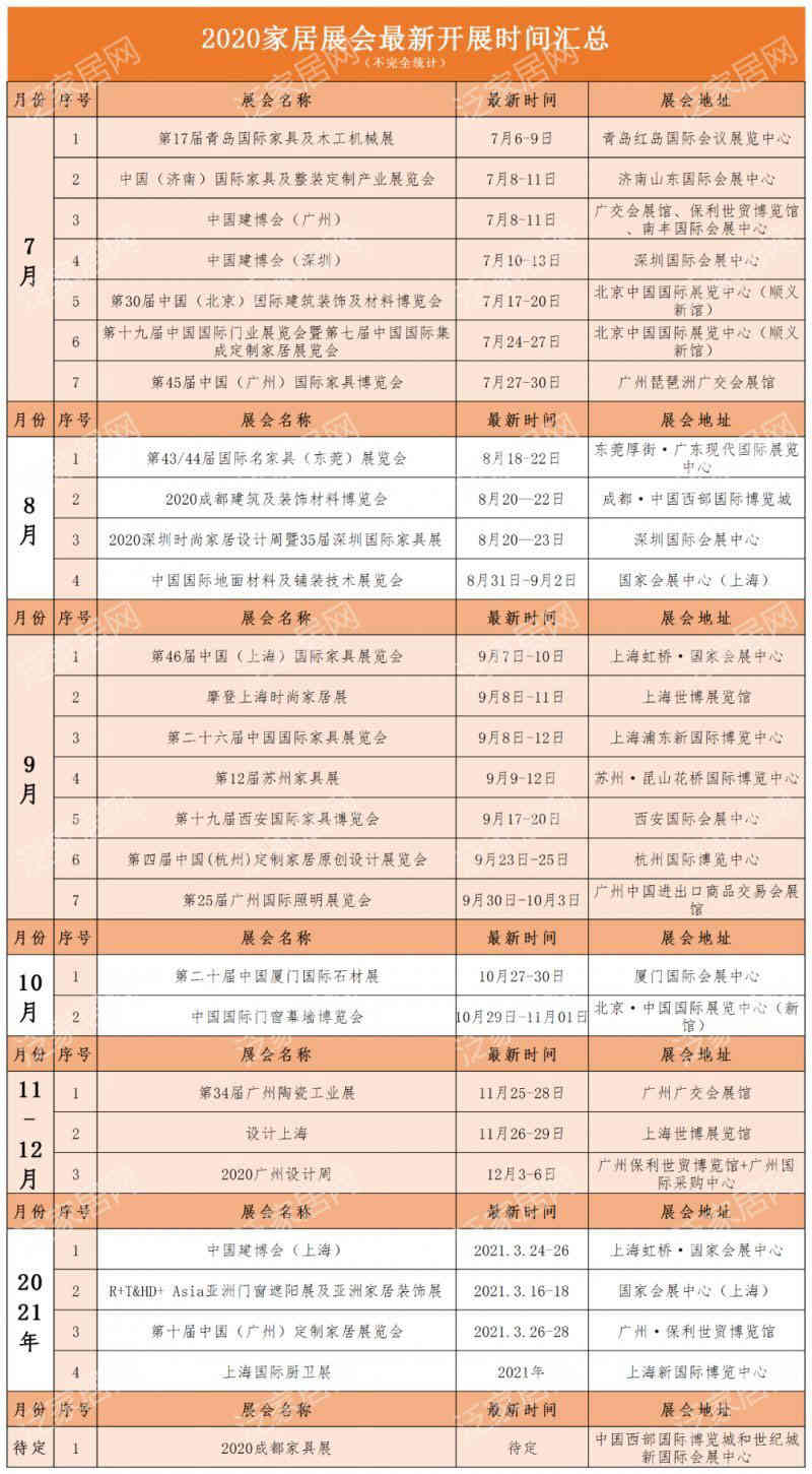 目前,2020成都國(guó)際家具展展期待定,而中國(guó)建博會(huì)(上海)、R+T&HD+ Asia亞洲門窗遮陽(yáng)展及亞洲家居裝飾展、中國(guó)(廣州)定制家居展覽會(huì)、上海國(guó)際廚衛(wèi)展已明確公布延期至2021年開(kāi)展。以下是7月至12月已確定展期的部分展會(huì),感興趣的朋友們可以一鍵搜藏。